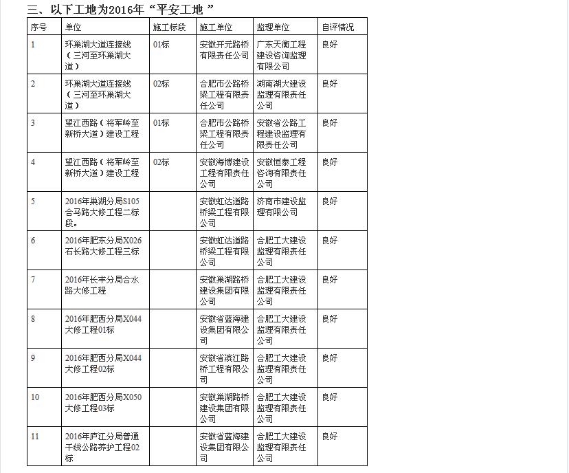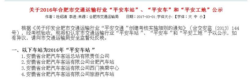 關于2016年合肥市交通運輸行業“平安車站”、“平安車”和“平安工地”公示