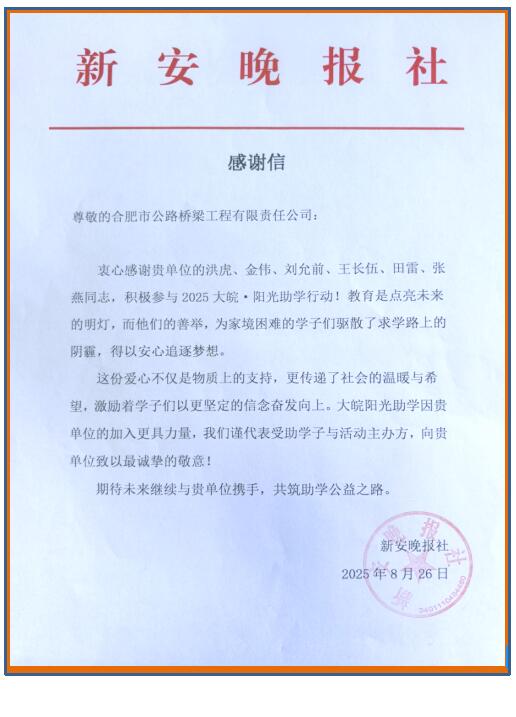 “大皖陽光助學因貴單位的加入更具力量,我們謹代表受助學子與活動主辦方,向貴單位致以最誠摯的敬意”,近日,新安晚報社向合肥路橋發來一封飽含深情的感謝信,對合肥路橋職工積極參與2025大皖・陽光助學行動表達誠摯謝意。