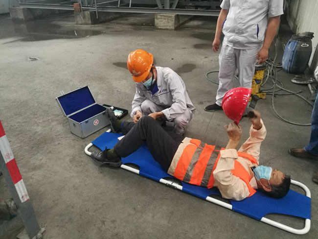 事件模擬真實(shí)事故,一名維修工人在對設(shè)備保養(yǎng)時(shí)不慎從滾筒平臺滑落,造成腿部受傷,隨后拌和站負(fù)責(zé)人緊急啟動(dòng)安全事故應(yīng)急預(yù)案,把傷者送醫(yī)救治。演練現(xiàn)場,作業(yè)人員熟練掌握應(yīng)急救援運(yùn)行的程序和方法,在了解和掌握了發(fā)生事故后及時(shí)上報(bào)情況,各責(zé)任組配合密切,各個(gè)環(huán)節(jié),流程銜接順利,協(xié)調(diào)組織有序,物資到位及時(shí)。