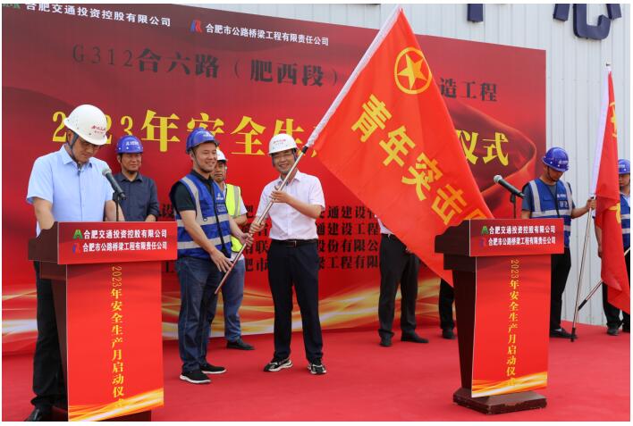 合肥交投合六項(xiàng)目公司副總經(jīng)理周恒星主持活動(dòng)儀式。啟動(dòng)儀式上,陳風(fēng)明代表建設(shè)單位向項(xiàng)目青年突擊隊(duì)授旗,楊楓代表施工單位向項(xiàng)目黨員先鋒崗授旗,項(xiàng)目經(jīng)理孫巍代表項(xiàng)目部發(fā)起“安全生產(chǎn)月”活動(dòng)倡議。