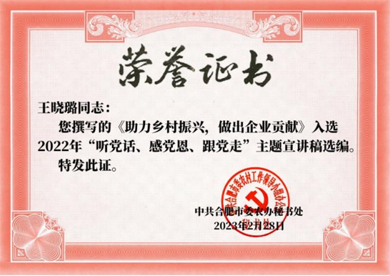 近日,由市委農(nóng)辦、市委宣傳部等七部門聯(lián)合舉辦的“聽黨話、感黨恩、跟黨走”主題教育活動(dòng)宣講稿選編結(jié)果正式揭曉。合肥路橋王曉璐同志撰寫的《助力鄉(xiāng)村振興,做出企業(yè)貢獻(xiàn)》成功入選。